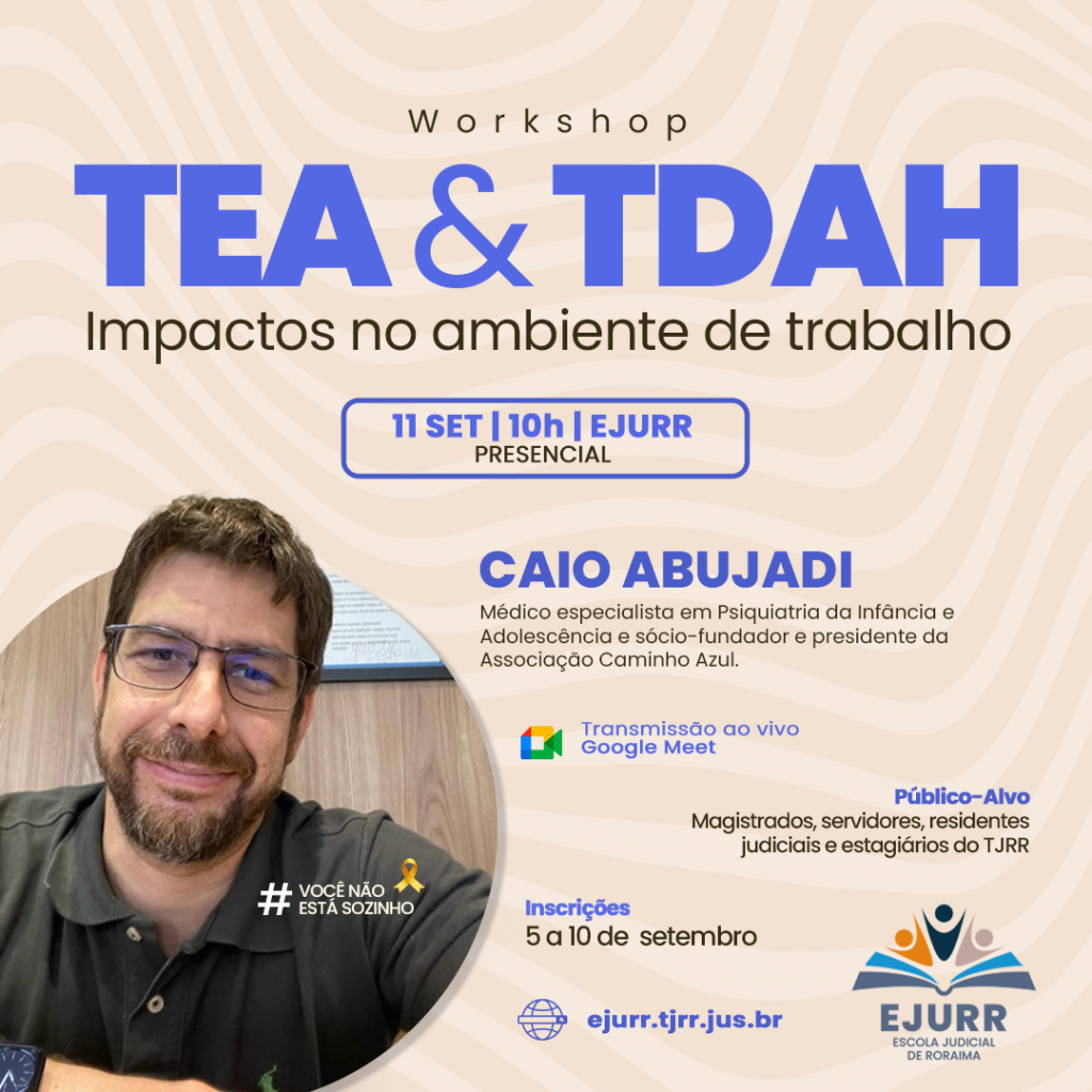 O objetivo do workshop é sensibilizar e orientar os participantes sobre Transtorno do Espectro Autista (TEA) e Transtorno do Déficit de Atenção com Hiperatividade no ambiente de trabalho e seus desafios. Ao todo, serão oferecidas 35 vagas para o formato presencial. As inscrições podem ser feitas até o dia 10 de setembro pelo site ejurr.tjrr.jus.br.
