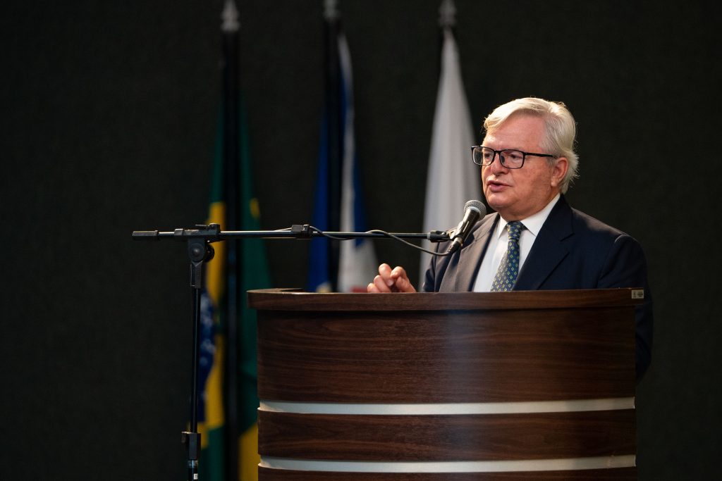 🔎Em destaque está o presidente do STJ, ministro Herman Benjamim. Ele é um homem branco, cabelos grisalhos e usa óculos. O ministro veste terno e discursa na tribuna. Ao fundo, o pavilhão de bandeiras.