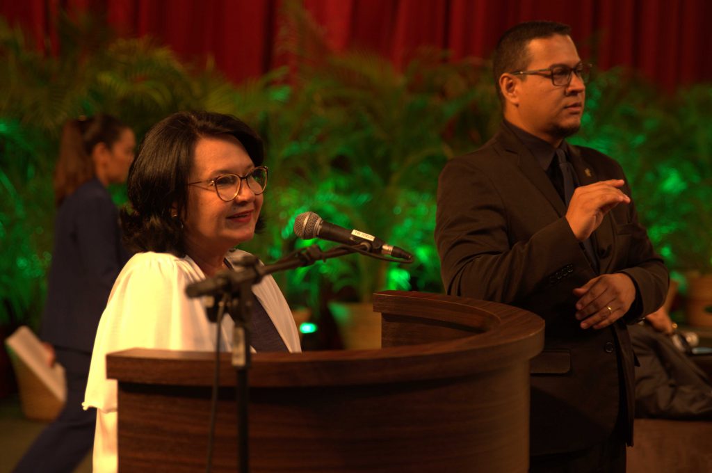 🔎Em destaque, está a diretora da Ejurr, desembargadora Tânia Vasconcelos. Ela é uma mulher de cabelos escuros e médios, que usa óculos, sorri, veste roupa branca e discursa na tribuna. Do lado direito, há um intérprete de Libras. Ao fundo, plantas iluminadas por uma luz verde e uma cortina vermelha.