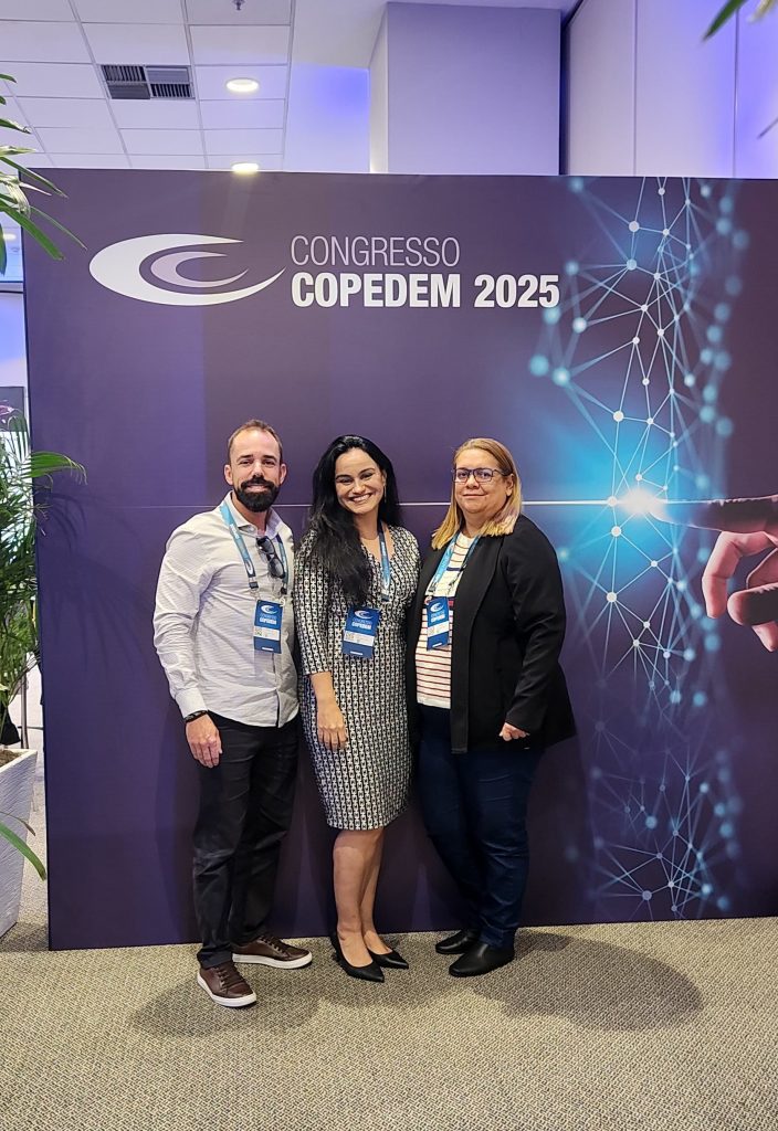 A imagem apresenta três pessoas que estão em pé, sorrindo, em frente a um painel roxo com o logotipo e as palavras “Congresso COPEDEM 2025”. À esquerda está um homem de camisa clara com crachá azul pendurado no pescoço. No centro, uma mulher de cabelos longos e escuros, vestindo um vestido estampado em preto e branco. À direita, uma mulher de cabelos loiros e lisos, usando óculos, blazer preto e blusa listrada. Ao fundo, há uma imagem digital com linhas e pontos conectando-se, simulando uma rede tecnológica, e uma mão apontando para um ponto luminoso.