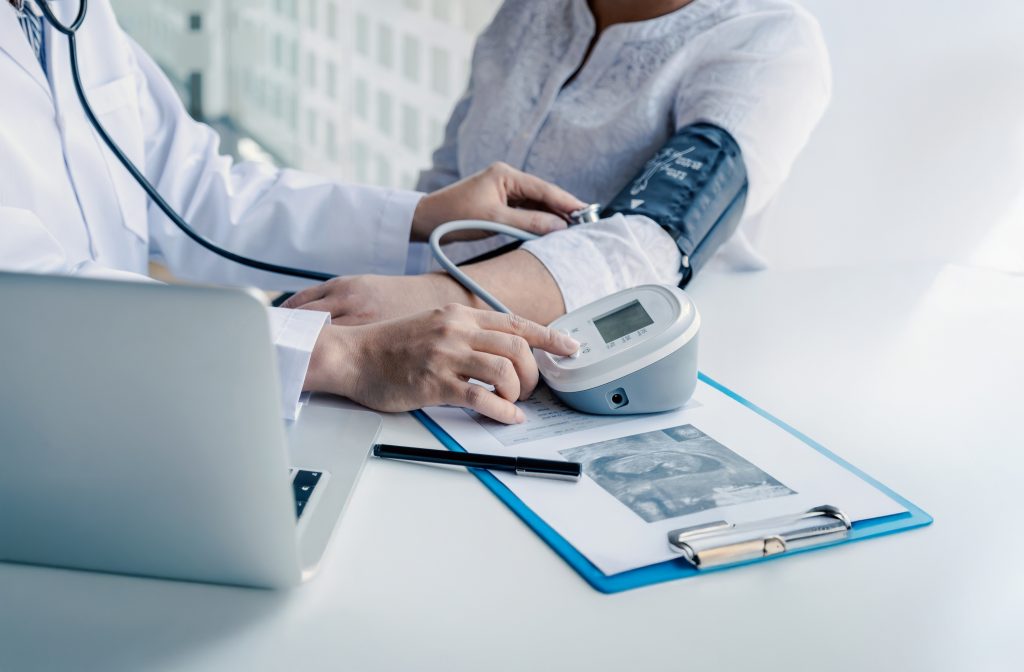 Na imagem, um profissional de saúde afere a pressão arterial de outra pessoa, com equipamento digital. Sobre a mesa, estão as mãos das pessoas, um notebook à esquerda, uma prancheta e uma caneta. Ao fundo, uma parede branca.