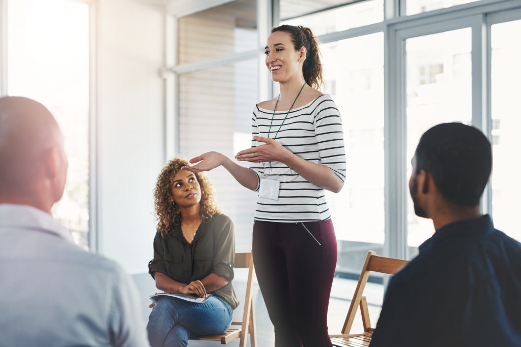 A imagem apresenta quatro pessoas em formato circular em uma sala com grandes janelas de vidros. Uma delas, é uma mulher branca, que sorri e gesticula. Do lado direito, há uma mulher negra que sorri levemente e observa. Outros dois homens estão no círculo de costas e observam. Um deles é pardo e outro é branco.