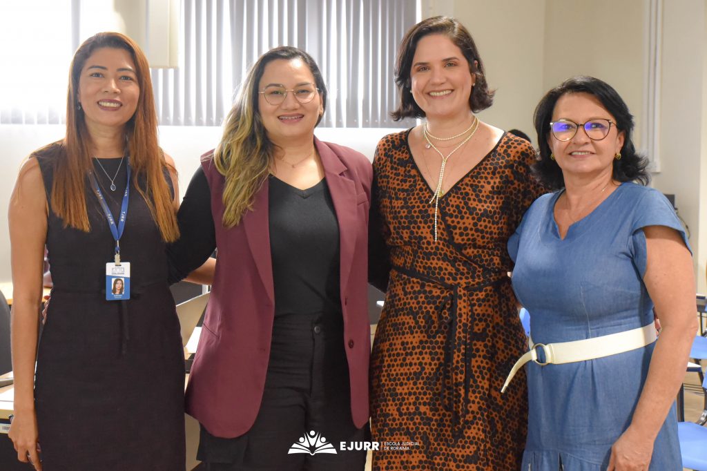 A imagem apresenta quatro mulheres, que sorriem e estão abraçadas para a foto. A primeira usa crachá, vestido preto e tem cabelos compridos; a segunda tem cabelos compridos, usa óculos e veste roupa preta e um colete na cor vinho; a terceira mulher, é a palestrante, que possui cabelos médios e escuros, usa colar e vestido; a quarta possui cabelos médios escuros, usa óculos, vestido azul e cinto branco. Na parte inferior, está a logo da Ejurr com letras brancas.