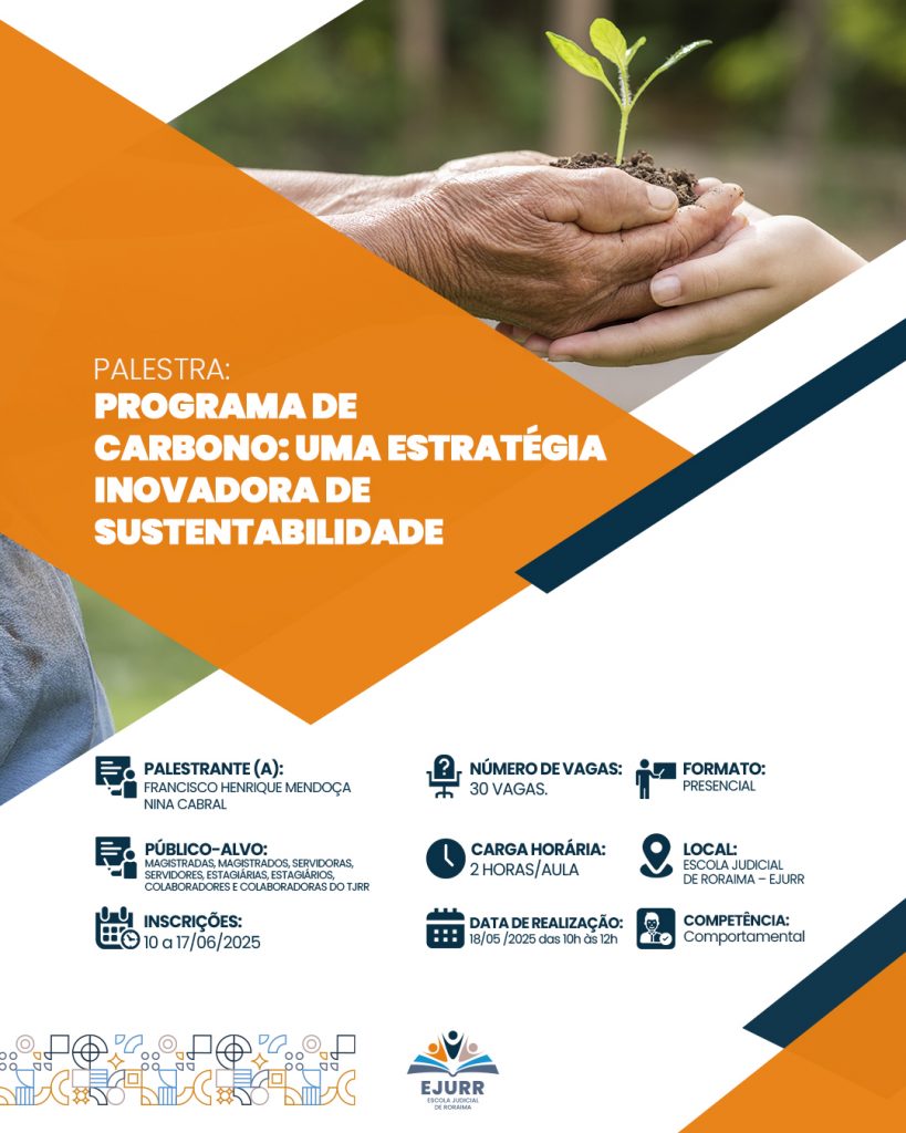 No dia 18 de junho, a Escola Judicial de Roraima (Ejurr) promoverá a palestra “Programa de Carbono: Uma Estratégia Inovadora de Sustentabilidade” . O evento será ministrado por Francisco Henrique Mendonça Nina Cabral, especialista em gestão ambiental e sustentabilidade organizacional, a partir das 10h na Ejurr.