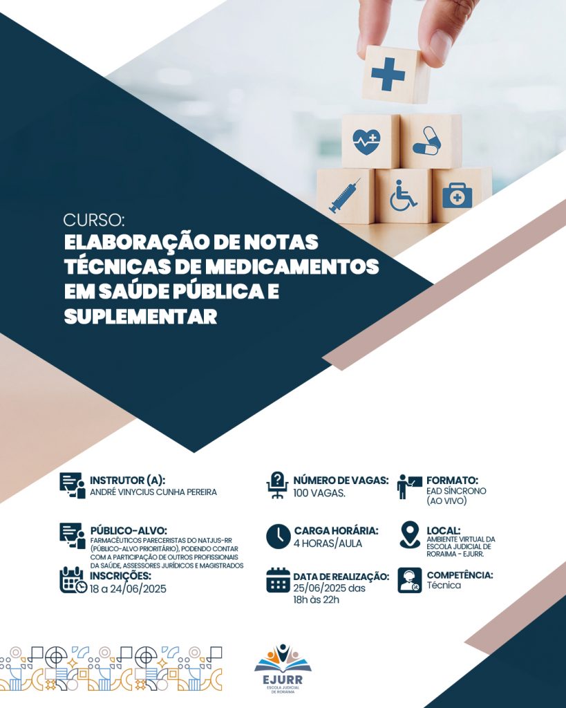 As inscrições para o curso Elaboração de Notas Técnicas de Medicamentos em Saúde Pública e Suplementar realizado pela Escola Judicial de Roraima (Ejurr) terminam nesta terça-feira, 24. A atividade será ministrada pelo farmacêutico André Vinycius Cunha Pereira.