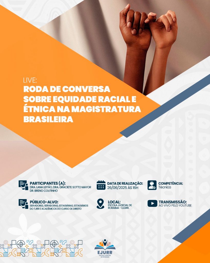 Paratodosverem – O card traz em destaque o título da live “Roda de Conversa sobre Equidade Racial na Magistratura Brasileira”. No canto direito superior há dois braços com as mãos entrelaçadas de pessoas com etnias diferentes, simbolizando a conexão e comunhão racial. Ao centro, sobre um fundo laranja, está o título do curso em letras brancas. Na parte inferior, ícones e textos informam os instrutores, público-alvo, inscrições, número de vagas, carga horária, data de realização, formato e competência. No rodapé, está o logotipo da Escola Judicial de Roraima