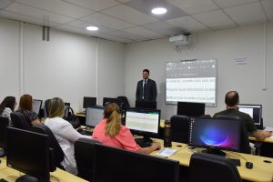 Alunos da oficina Libras para Atendimento assistem a aula do dia 26/07, em que o instrutor Maycon Kennedy Barbosa Moletta leciona o conteúdo da aula por meio da comunicação por libras e o uso de slides.