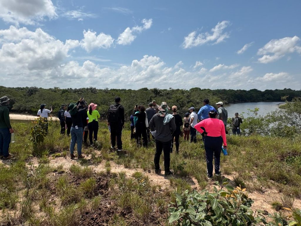 Foto 1:Uma foto tirada ao ar livre em frente ao grupo, há uma paisagem de mata fechada e, ao fundo, é possível ver um rio ou lago cercado por árvores. O céu está azul com nuvens brancas. A cena sugere uma atividade de ecoturismo, estudo da natureza ou passeio em área ribeirinha.