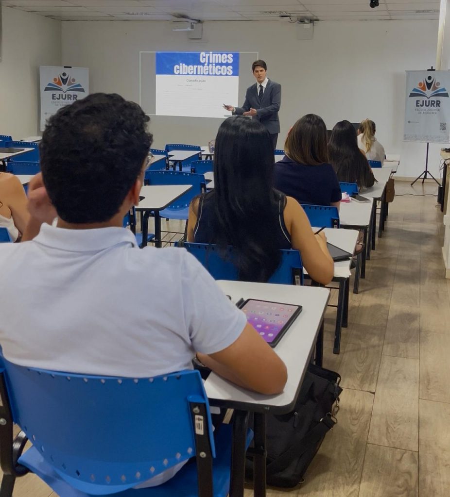 A imagem mostra homens e mulheres sentados em cadeiras com detalhes em azul, em fila reta. Eles observam o professor que está a frente da sala, um homem branco que usa treno e gravata e gesticula com as mãos. Ao fundo, está a projeção na parede em cores branca e azul com o título “Crimes cibernéticos”. nas lateriasi esquerda e direita, estão banners com a logo da Ejurr.