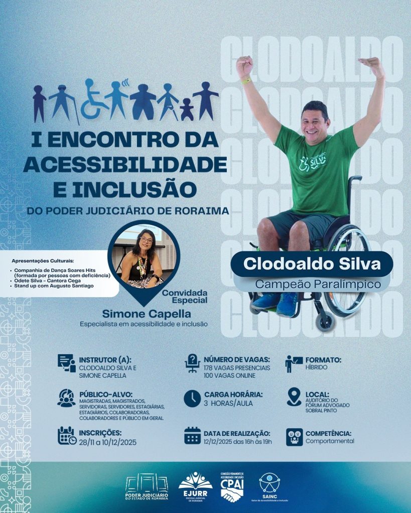 O card traz em destaque o título do evento. À esquerda, há uma arte com ícones representando pessoas diversas, incluindo uma pessoa em cadeira de rodas, pela direita. No centro-esquerda, há uma foto da convidada Simone Capella, sorrindo, usando óculos e um colar colorido. À direita, há uma foto grande de Clodoaldo Silva, atleta paralímpico, sentado em uma cadeira de rodas e levantando os braços com expressão de comemoração. Na parte inferior, ícones e textos informam os instrutores, público-alvo, inscrições, número de vagas, carga horária, data de realização, formato e competência. No rodapé, está o logotipo da Escola Judicial de Roraima, do Poder Judiciário de Roraima, da Comissão Permanente de Acessibilidade e Inclusão e do Setor de Acessibilidade e Inclusão.
