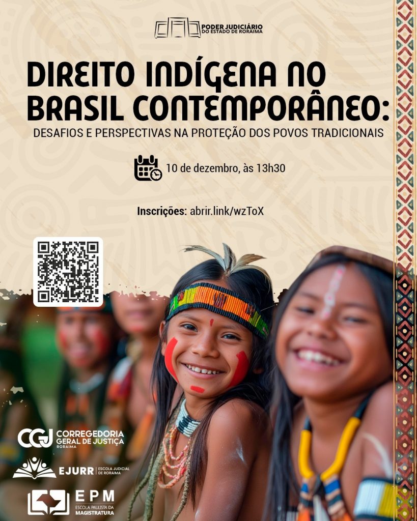 O card traz no alto a logo do Poder Judiciário, abaixo o título do evento, a data e o link de inscrições. No centro, há um QRCode. Na parte inferior esquerda estão as logos das instituições parceiras. Em destaque, crianças indígenas sorriem, um delas apresenta a imagem levemente desfocada; ao fundo, outras pessoas indígenas estão desfocadas. Na laterla direita, estão grafismos que remetem a temática indígena.