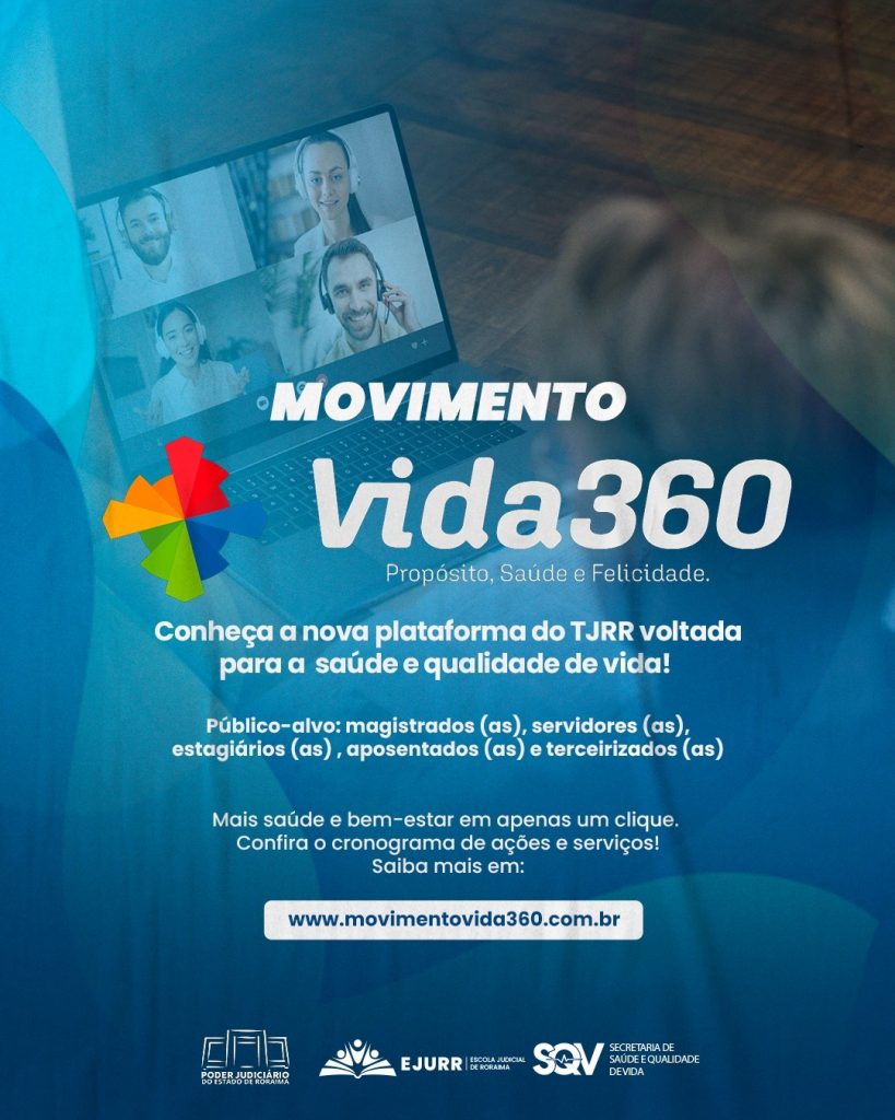 A Escola Judicial de Roraima (Ejurr) em parceria com a Secretaria de Saúde e Qualidade de Vida (SQV), lançou a Plataforma Vida 360 – Propósito, Saúde e Felicidade, um website voltado para a o desenvolvimento humano, o bem-estar integral e a melhoria da saúde biopsicossocial no ambiente institucional.