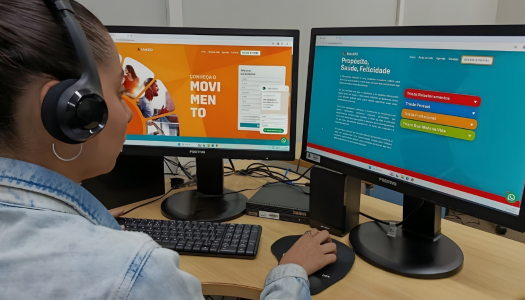 A imagem mostra uma mulher branca sentada em uma mesa de trabalho. Ela está de perfil, trajando um casaco jeans e joias prateadas, usando fone de ouvido em frente a um computador com dois monitores, observando o portal Movimento Vida 360.