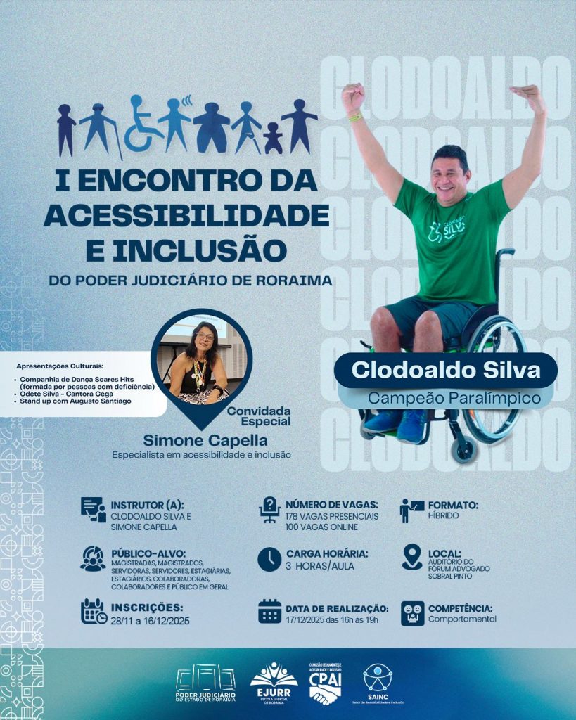 O card traz em destaque o título do evento. À esquerda, há uma arte com ícones representando pessoas diversas, incluindo uma pessoa em cadeira de rodas, pela direita. No centro-esquerda, há uma foto da convidada Simone Capella, sorrindo, usando óculos e um colar colorido. À direita, há uma foto grande de Clodoaldo Silva, atleta paralímpico, sentado em uma cadeira de rodas e levantando os braços com expressão de comemoração. Na parte inferior, ícones e textos informam os instrutores, público-alvo, inscrições, número de vagas, carga horária, data de realização, formato e competência. No rodapé, está o logotipo da Escola Judicial de Roraima, do Poder Judiciário de Roraima, da Comissão Permanente de Acessibilidade e Inclusão e do Setor de Acessibilidade e Inclusão.