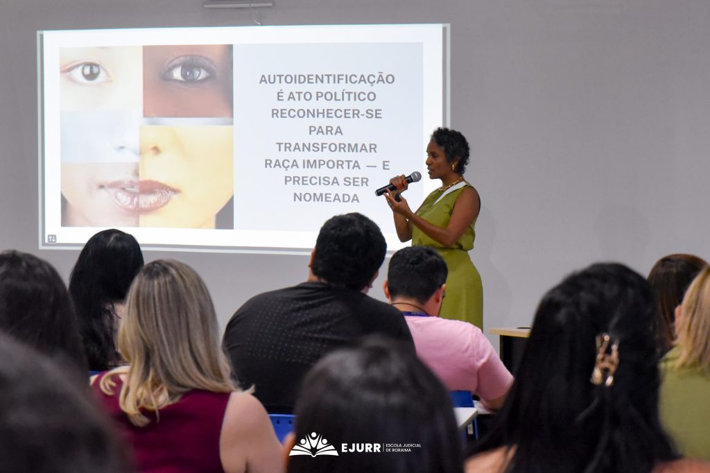 Foto 2: A imagem mostra pessoas sentadas de costas, algumas estão levemente desfocadas. Em destaque está a palestrante, uma mulher negra de cabelos curtos, que usa acessórios dourados, veste roupa verde e fala ao microfone. Na parede, há uma tela projetada contendo detalhes de diferentes rostos que se completam, tendo ao lado as frases “Autoidentificação é ato político. Reconhecer-se para transformar. Raça importa – e precisa ser nomeada. Na parte inferior, está a logo da Ejurr.