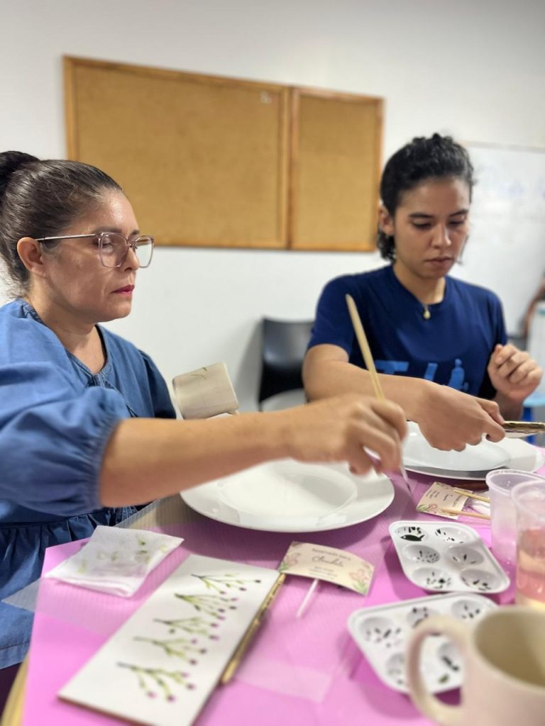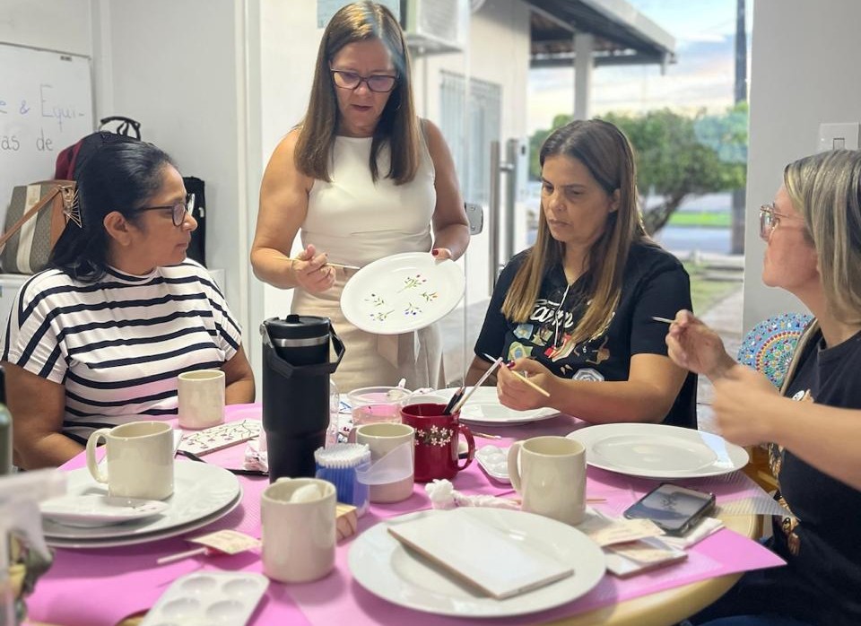 Em cada oficina, a pedagoga Silvana Mendes promove momentos de relaxamento e apresenta os materiais utilizados e as técnicas de pintura para cada superfície. Com cinco anos de experiência, Silvana reforça a importância das participantes terem um tempo para desacelerar da rotina profissional e buscar alternativas além das redes sociais e equipamentos eletroeletrônicos.